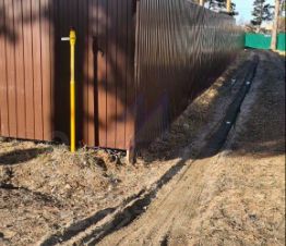 Забор с соседями — кирпич, по наружному периметру — металлопрофиль.