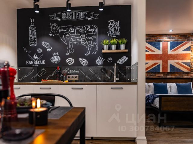 НА КУХНЕ расположена дизайнерская столовая зона, бытовая техника (большой холодильник, микроволновая печь, электрочайник, плита), разнообразная стильная посуда и большой набор бокалов для напитков, кастрюли и сковороды для приготовления еды.